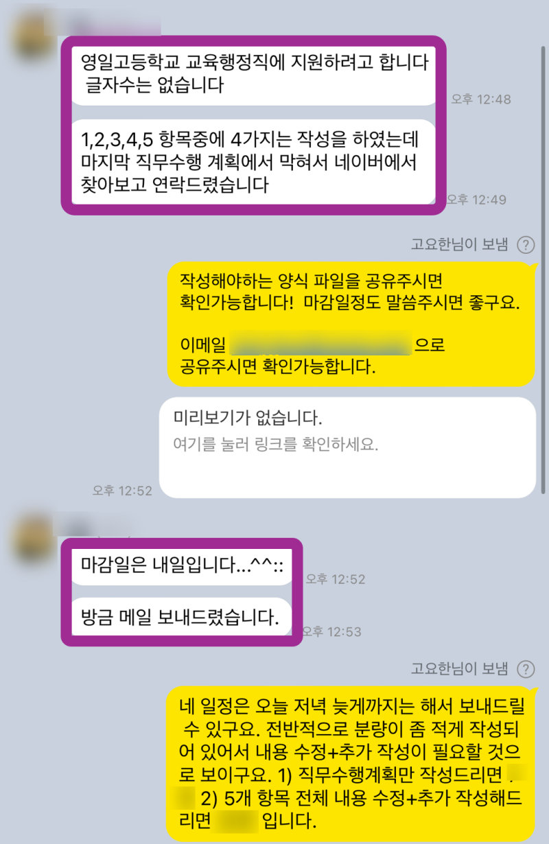 이번 지원자분은 영일고등학교 교육행정직에 지원하시는 경력자분이셨습니다. 꼼꼼하시고 성실한 성격이셨지만, 자기소개서 작성에 어려움을 느끼고 계셨습니다. 특히, 경력 사항을 영일고등학교의 인재상과 연결하는 부분에서 막막함을 느끼셨다고 합니다. 또한, 지원 동기 및 입사 후 포부를 작성하는 데 있어서도 차별화된 강점을 어필하고 싶어 하셨습니다. 솔직히 말씀드리면, 처음 가져오신 자소서는 아쉬운 점이 많았습니다.
