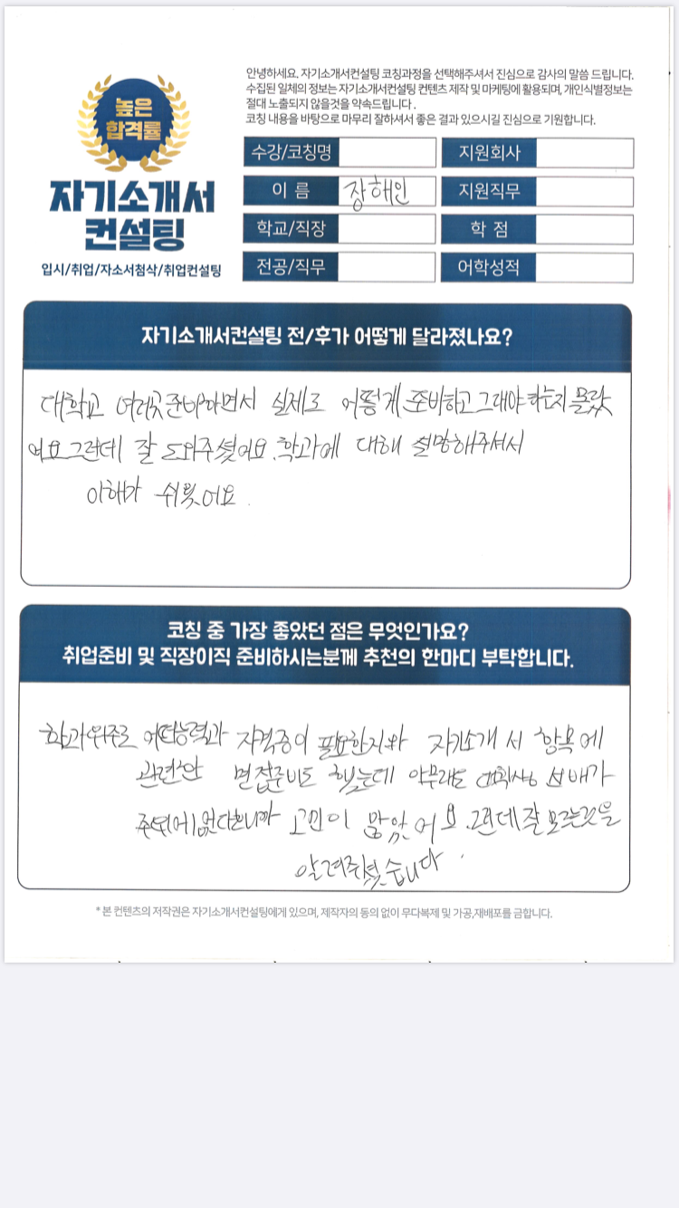 #자기소개서 #자소서 #자기소개서대필 #자소서대필 #자기소개서첨삭 #자소서첨삭 #취업컨설팅 #취업준비 #합격자소서 #대기업자소서 #신입자소서 #서울대학교 #서울대학교자소서 #서울대학교경영학과 #경영학과 #자기소개서전문가 #취업성공 #서류합격 #첨삭전문가 #자기소개서의뢰 #취업고민 #채용직무정보#입시컨설팅#수시컨설팅#정시컨설팅#학생부종합전형#대입컨설팅#고3맘#고1맘#고2맘#대학합격#입시전략#면접컨설팅#입시결과#진로상담