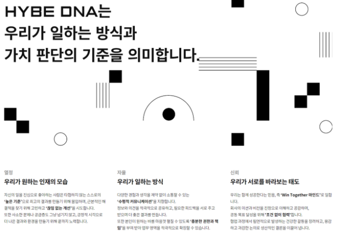 하이브 분석 자료 (핵심가치, 비전, 인재상, 사업 등)