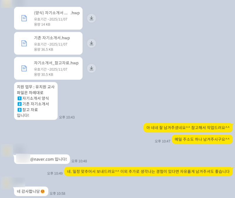 공유해주신 이력서와 자기소개서를 토대로, 저는 지원자분의 강점과 경험을 분석하고, 유치원 교사로서의 잠재력을 최대한 어필할 수 있는 방향으로 컨설팅을 진행했습니다. 먼저, 자기소개서의 전체적인 흐름을 재구성하고, 각 문항별로 핵심 키워드를 선정하여 강조했습니다. 또한, 유치원 교육 철학에 대한 이해를 높이고, 실제 교육 현장에서 적용할 수 있는 구체적인 사례를 제시하도록 지도했습니다. 면접 준비 과정에서는 예상 질문을 선정하고, 답변을 구성하는 연습을 통해 자신감을 향상시켰습니다. 꼼꼼하게 확인하고 준비해야겠죠?
